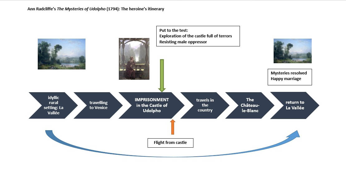 Below you can see the main phases of the heroine’s journey in The Mysteries of Udolpho.